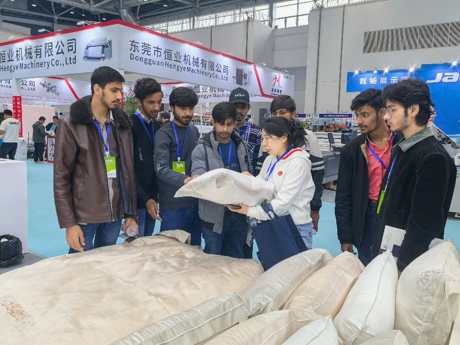 活动中,师生们驻足于各大展区,专业教师聚焦展会前沿智能纺织服装设备、创新面料展品,深入钻研工艺技术、材料特性与行业发展趋势,与参展企业深度交流对接,为专业教学改革、科研创新与产教融合积累了丰富的实践素材。在纺织现场教学环节,任课教师隋全侠结合国际纺织行业通用标准,立足专业核心知识,紧扣纺织工艺、面料研发、生产实操等关键内容,为巴基斯坦留学生展开细致讲解与示范教学。留学生们积极参与实践,主动提问交流,全面掌握纺织专业基础技能,真切感受到中国纺织产业的技术实力与文化底蕴。