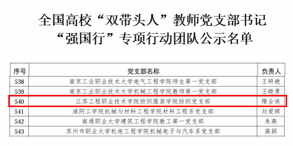 日前,教育部思想政治工作司对全国高校“双带头人”教师党支部书记“强国行”专项行动团队名单进行公示,我校纺织服装学院纺织党支部成功入选。