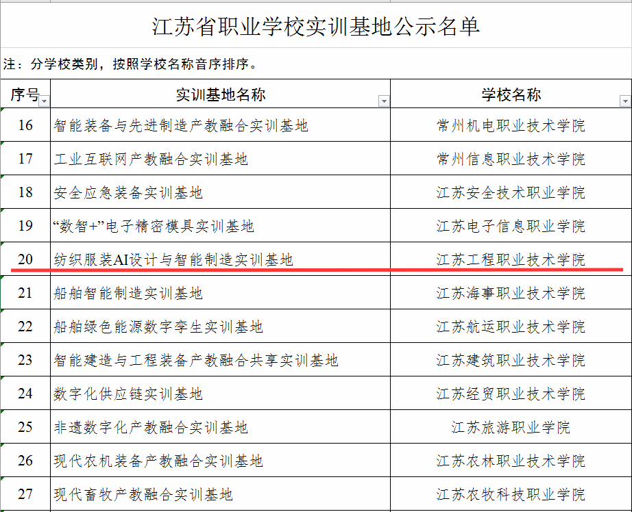 近日,省教育厅正式公布“江苏省职业学校高水平实习实训基地建设”立项名单。我校申报的“纺织服装AI设计与智能制造实训基地”项目成功入选。
