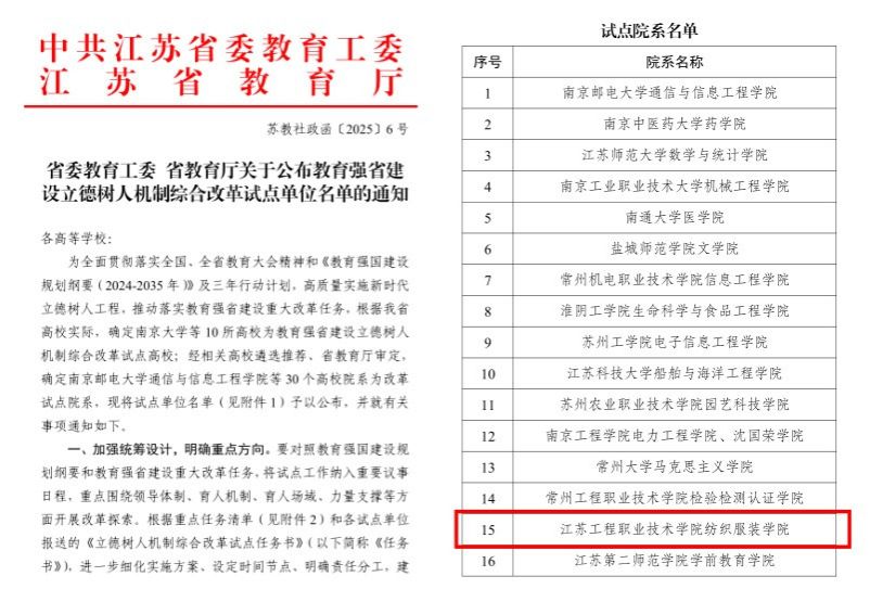 近日,中共江苏省委教育工委、江苏省教育厅发布《关于公布教育强省建设立德树人机制综合改革试点单位名单的通知》(苏教社政函〔2025〕6号),我校纺织服装学院成功入选,成为全省30个获批试点的高校院系之一。