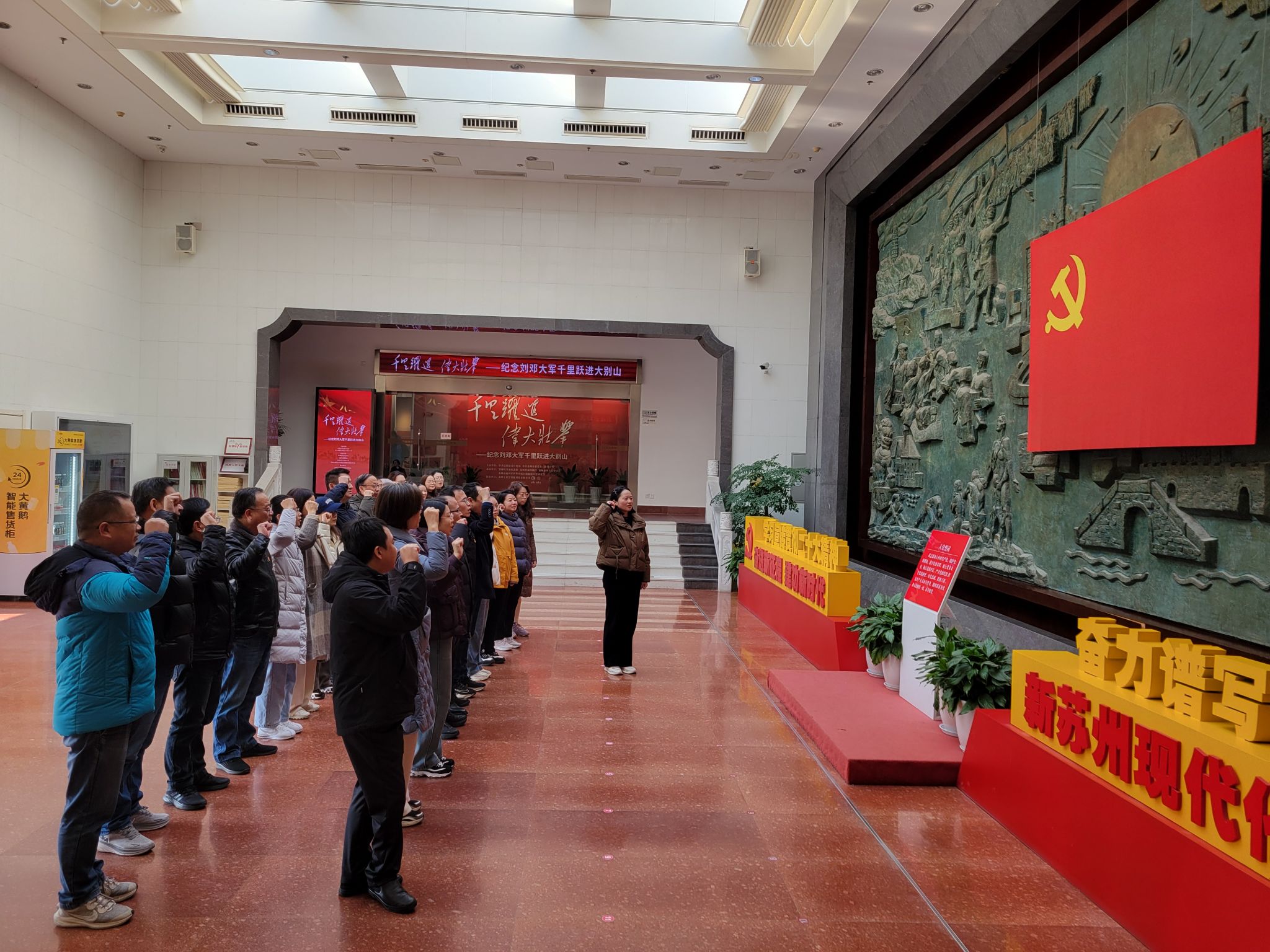 在苏州革命博物馆内,党员们依次参观了各个展厅,深入了解了苏州地区的革命历史,以及中国共产党在革命斗争中的英勇事迹。大型多媒体半景画演示项目《阳澄烽火》更是将大家带回了那个战火纷飞的年代,让大家深刻感受到了革命先烈的英勇与伟大。在夏爱萍的带领下,全体党员在庄严的宣誓墙前重温了入党誓词,重忆入党初心,进一步坚定理想信念。
