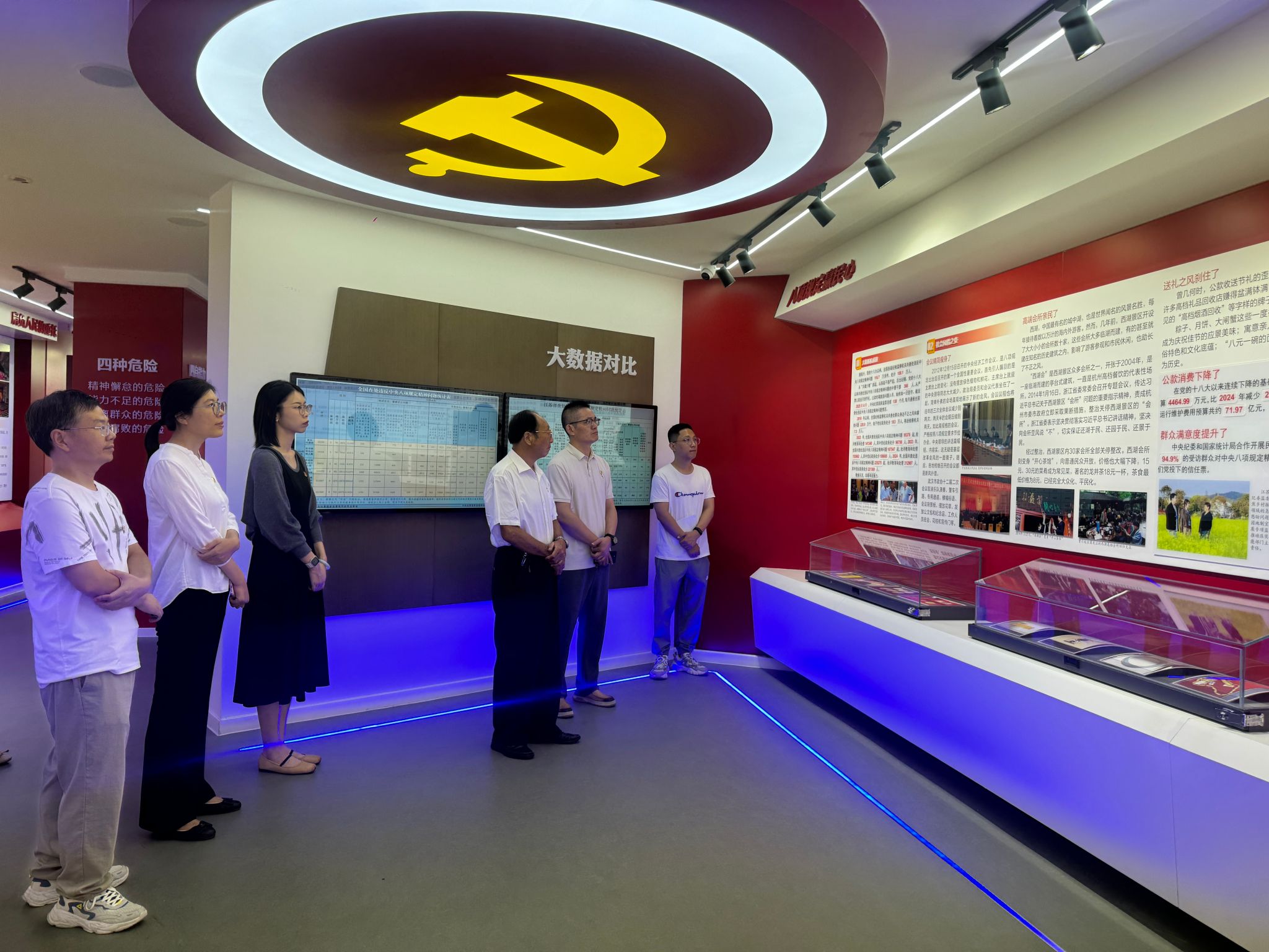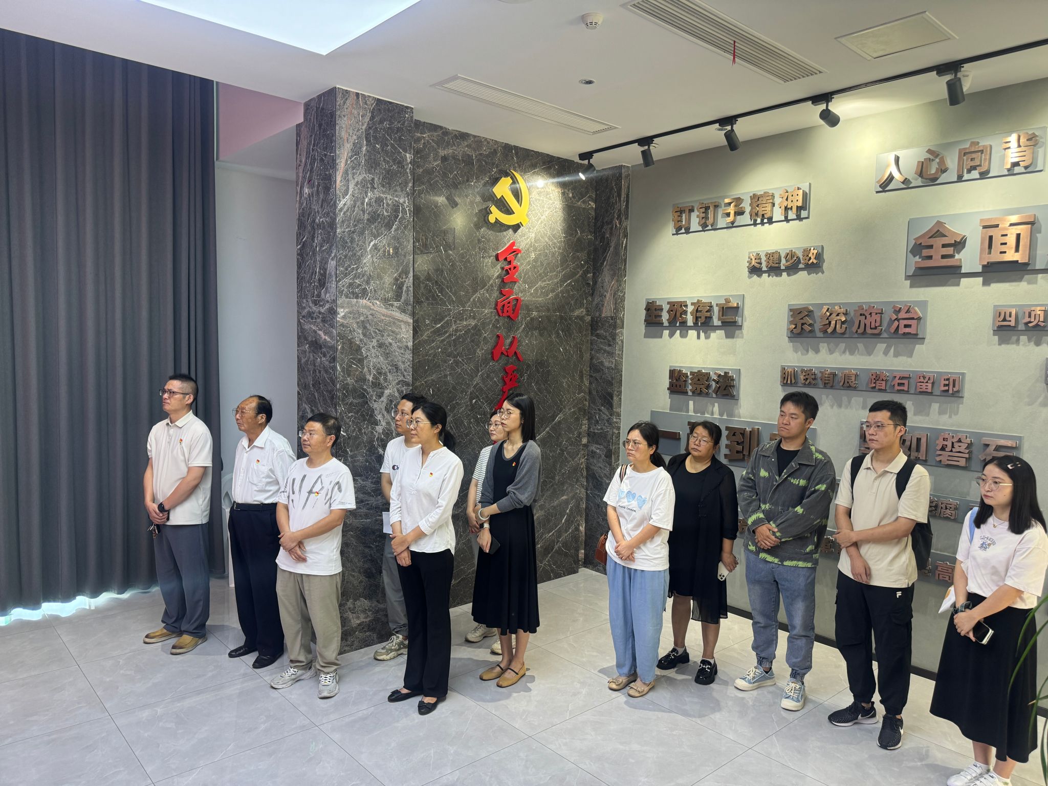 在崇川区廉情教育中心,党员们依次参观了“人心向背”“以上率下”“踏石留印”三大主题展区。丰富的图文史料、鲜活的警示案例与沉浸式的互动体验,让大家深刻体会到违纪违法的沉痛代价,真切感受到深入学习贯彻中央八项规定精神的实践成效。
