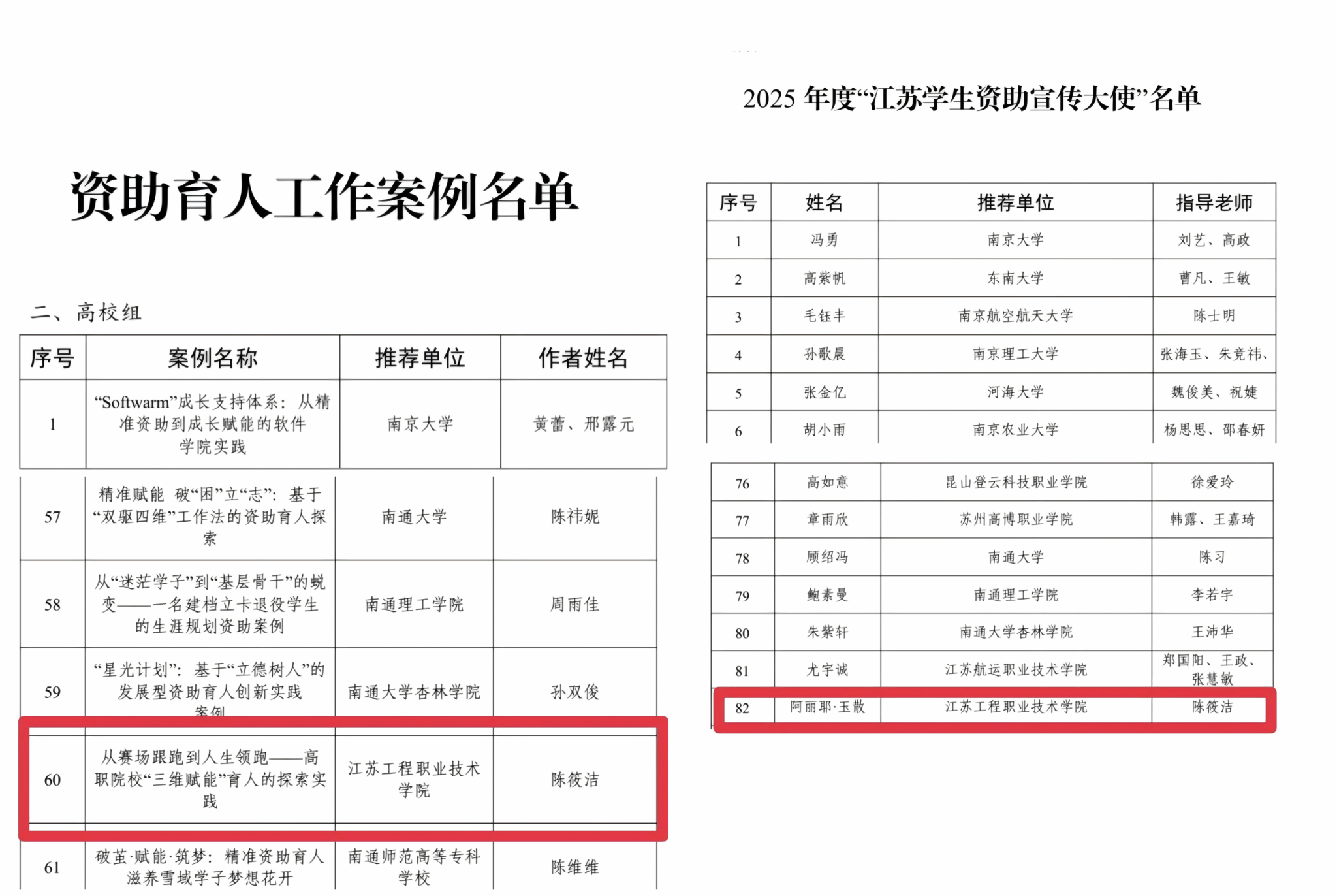 近日,江苏省教育厅公布了2025年“苏乡永助”资助育人主题活动的评选结果。我院报送的三项作品及个人均入选。学生资助短视频《一株乌斯曼草的绽放》入选“优秀资助育人主题视频”,案例《从赛场跟跑到人生领跑——高职院校“三维赋能”育人的探索实践》入选“资助育人工作案例”,我院学生阿丽耶·玉散入选“江苏学生资助宣传大使”。